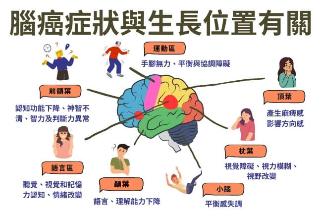 腦瘤的症狀因病灶在腦內的大小,位置及分佈的型態而定,因為腫瘤在顱內有限空間中生長,所以它會造成腦內壓力增加並且傷害到重要組織。