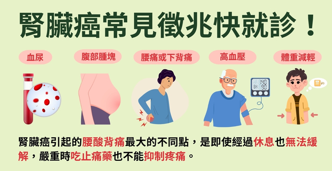 - 腰痛或下背痛:腫瘤壓迫或侵犯腎包膜時可能出現。