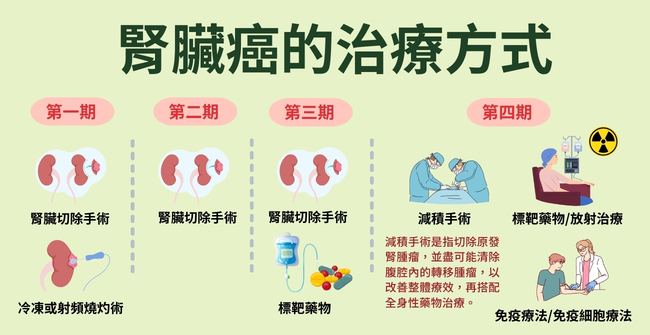腎臟癌的治療首選是手術切除,尤其是早期的腎細胞癌。隨著醫療科技進步,不但手術方式更精細、傷口更小,還有冷凍治療、標靶藥物與免疫療法等多種選擇。