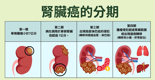 腎臟癌的分期有助於判斷病情與選擇治療策略,主要依腫瘤大小、淋巴結轉移、遠端轉移分類。